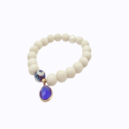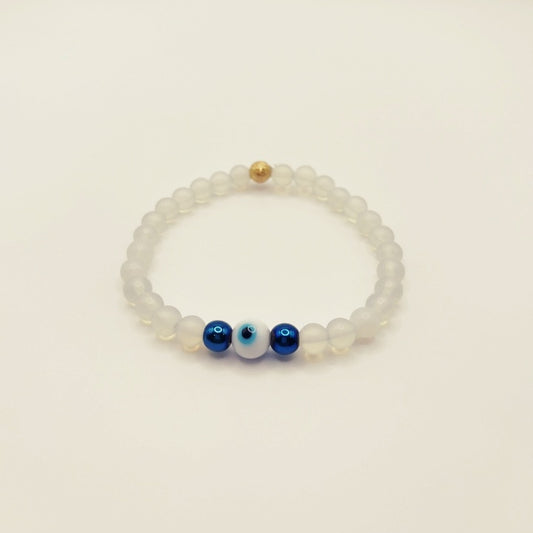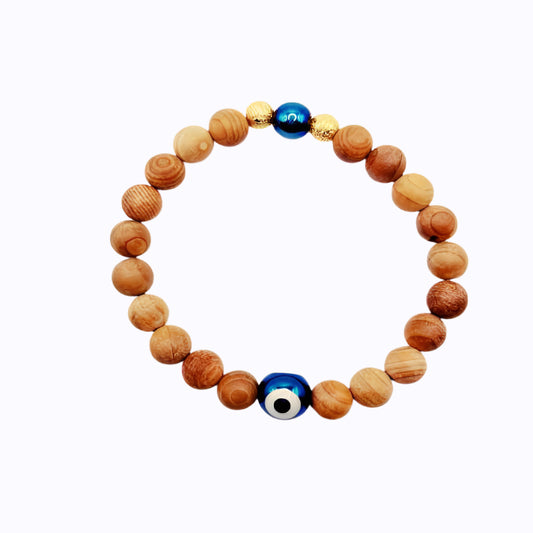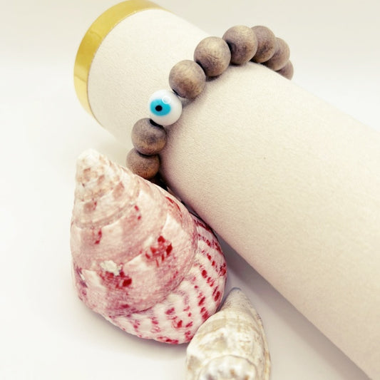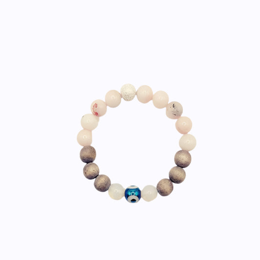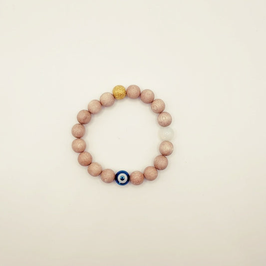 The Evil Eye Wood Bracelet: Moon Opalite and Rose Quartz Bead