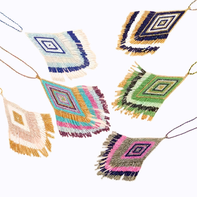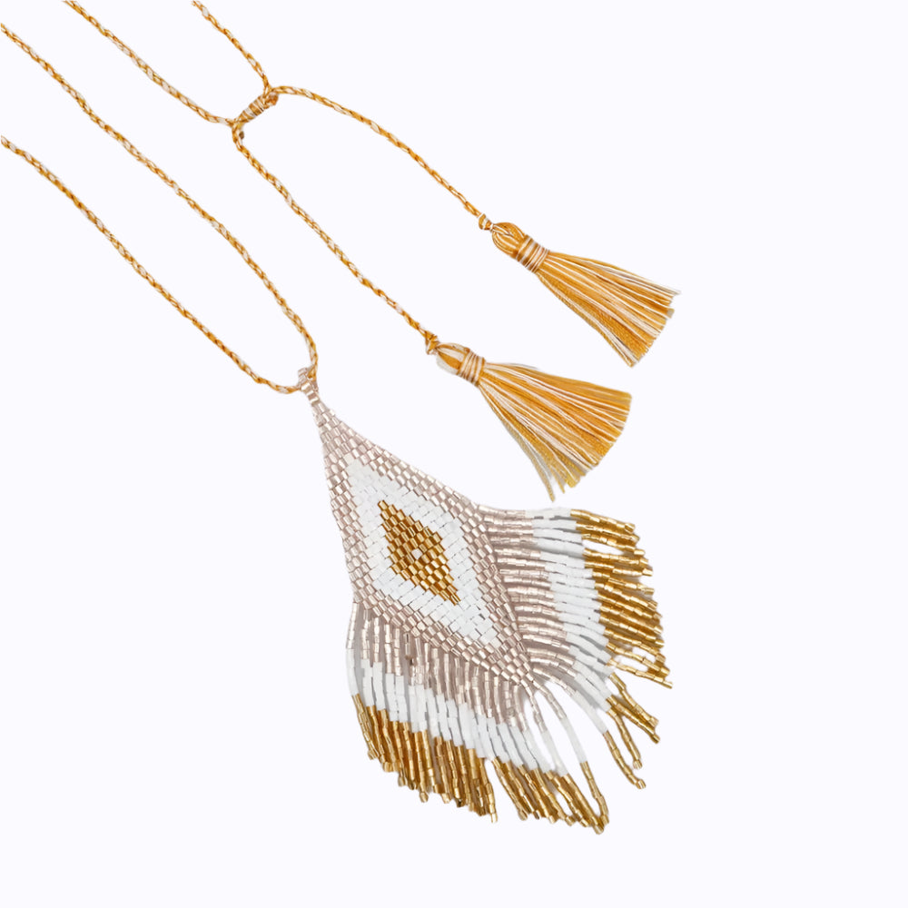 This beautiful Miyuki bead badge necklace celebrates all that is meant to be freedom and joy! Strung on a whimsical matching cord necklace, this eye-catching medallion is adjustable by sliding the cord necklace. Fringey fun!